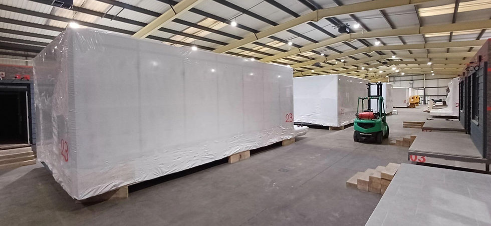 EcoShrink installed shrink wrap protection around multiple modular homes built for Wates, preparing the units for delivery to Cardiff. The wrap package created a clean, weather-resistant outer envelope designed to protect the units during storage, handling and transport, helping preserve the external finish and reduce exposure during the delivery programme.